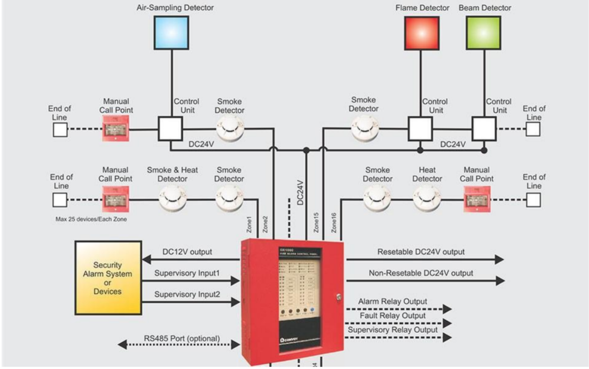 Conventional systems operate by using physical cabling to connect multiple detectors and manual call points to a central control panel. These systems are commonly applied in small commercial premises such as shops, restaurants, and offices, where the building is divided into several detection zones. Each zone is typically equipped with alarm devices such as bells or electronic sounders. When a detector or manual call point is activated, the control panel indicates the affected zone through visual indicators or text display, allowing personnel to investigate and identify the source of the alarm. - Addressable Systems
