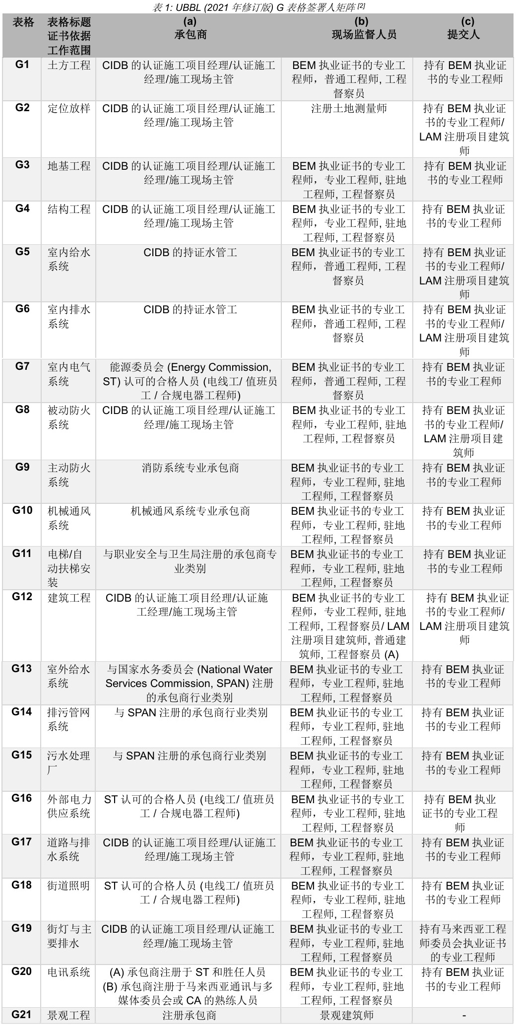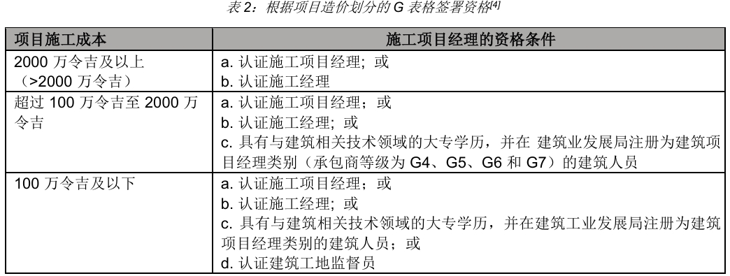关于认证施工经理 (Certified Construction Manager, CCM) 与认证施工项目经理 (Certified Construction Project Manager, CCPM) 在何种情境下签署G表格,以及哪些项目需要他们签署,业界常常存在疑惑。CIDB已发布说明,明确了施工项目经理的资格要求,详见表2。