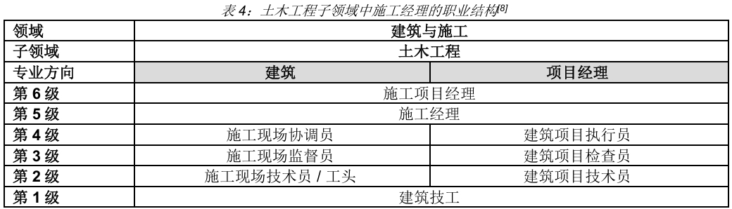 表3与表4概述了建筑与施工领域中,特别是土木工程子领域内施工项目管理职业的层级结构。其中,“领域”指的是更广泛的产业领域,而“子领域”则具体细分至某一专业领域——在本案例中即为土木工程。
